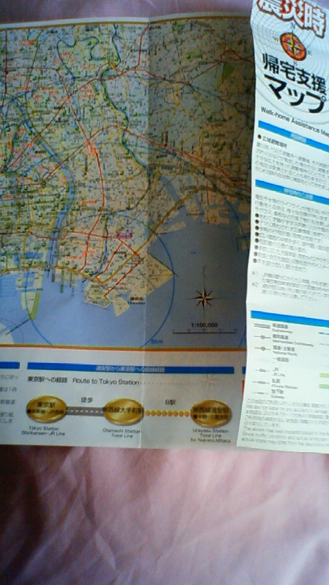 ・揺れた時、窓から雷光が見えました。 ・外へ避難誘導しました。 ・避難解除~待機、生産再開の決定、電車が止まったんで社員の帰宅手配と、会社宿泊者の食事手配を。 ・ホントは泊まりたかったけど、翌日土曜は母の13回忌。帰らなければなりません。 ・一人帰りそびれた人を社用車に乗せ、帰る事に。出発は20時。 ・普段なら1時間+1時間のところ、2時間+3時間。 ・しかも家までたどり着けず、東銀座でクルマをあきらめ、駐車場に止め地下鉄で帰宅したのは夜中の2時でした。 ・クルマがあふれ、あちこちで通行止め状態となり、迷路と化した銀座~築地間に1時間半もいました。 ・カミさんは5km先の眼科~徒歩帰宅、長女は5km先の会社説明会場~徒歩帰宅。 ・そして次女は友達とディズニーランド。 ・次女は結局、キャプ○ンEOで一泊し、翌日15時過ぎに帰宅でした。 ・土曜は5時半に起き、父の病院が8時半、実家を経由し、寺が10時。 ・法事を終え、逆のコースをたどって17時に帰宅。 ・その日は家族4人でリビングに寝ました。 ・そして今日、電車に乗ってクルマを取りに行きました。 ・クルマを近所のコインパーキングに停め、朝食のパンを買いにスーパーへ。 ・肉とパンと牛乳の棚が空っぽ。びっくりしました。 ・ネットとかの情報で、みんながわっと買いだめに走ったのでしょうか。 どうなっちゃうんだろう。。 写真は次女がもらってきた防災マップ。円の注目がランドです。そのほかにペラペラの保温用アルミマットとスナックが配布されたそうです。