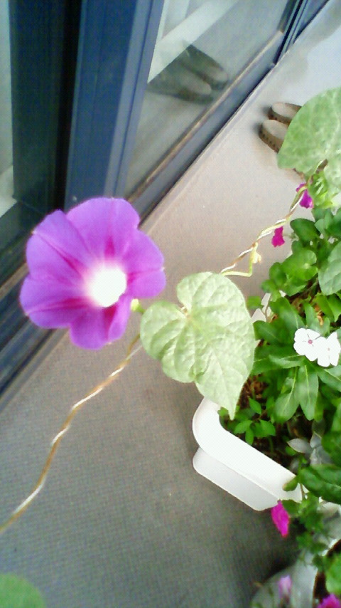 例の、ヘンな葉っぱの朝顔がきのうようやく咲いたはず。