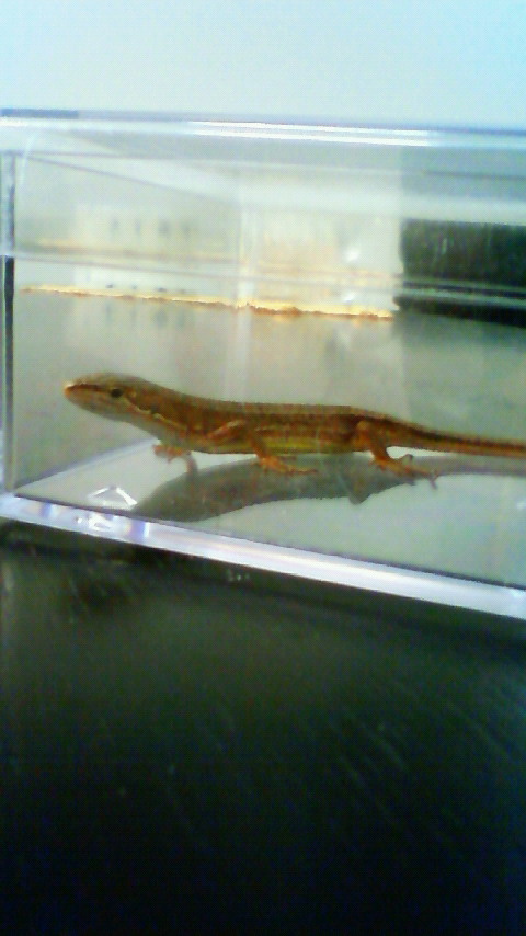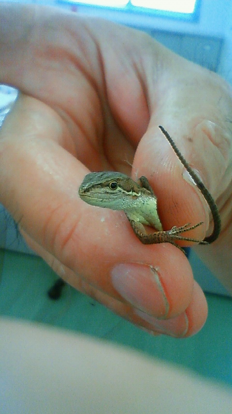 ・会社の事務所にカナヘビ(ちっちゃいとかげ)が迷い込みました。 ・先日、事務所入口の自動ドアの前でじっとしていたから、つまんで花壇まで運んだヤツとは別の個体です。 ・最初あっさり捕まえたのですが、油断したら事務のおねーちゃんの袖机の下にもぐりこんで出てこない。 ・昼休みを挟んで90分後に再逮捕して撮った写真がこれ。 しばらくみんなで観察したあと、外に放してあげました~ PR